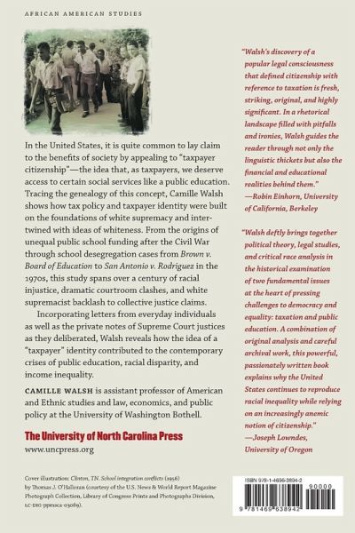 In the United States, it is quite common to lay claim to the benefits of society by appealing to “taxpayer citizenship” — the idea that, as taxpayers, we deserve access to certain social services like a public education. Tracing the genealogy of this concept, Camille Walsh shows how tax policy and taxpayer identity were built on the foundations of white supremacy and intertwined with ideas of whiteness. From the origins of unequal public school funding after the Civil War through school desegregation cases from Brown v. Board of Education to San Antonio v. Rodriguez in the 1970s, this study spans over a century of racial injustice, dramatic courtroom clashes, and white supremacist backlash to collective justice claims. Incorporating letters from everyday individuals as well as the private notes of Supreme Court justices as they deliberated, Walsh reveals how the idea of a “taxpayer” identity contributed to the contemporary crises of public education, racial disparity, and income inequality.