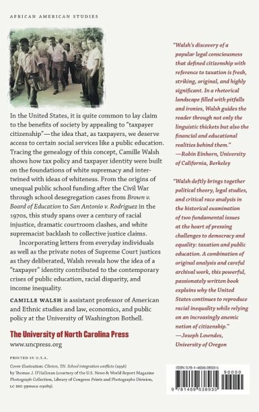 In the United States, it is quite common to lay claim to the benefits of society by appealing to "taxpayer citizenship--the idea that, as taxpayers, we deserve access to certain social services like a public education. Tracing the genealogy of this concept, Camille Walsh shows how tax policy and taxpayer identity were built on the foundations of white supremacy and intertwined with ideas of whiteness. From the origins of unequal public school funding after the Civil War through school desegregation cases from Brown v. Board of Education to San Antonio v. Rodriguez in the 1970s, this study spans over a century of racial injustice, dramatic courtroom clashes, and white supremacist backlash to collective justice claims. Incorporating letters from everyday individuals as well as the private notes of Supreme Court justices as they deliberated, Walsh reveals how the idea of a "taxpayer" identity contributed to the contemporary crises of public education, racial disparity, and income inequality.
