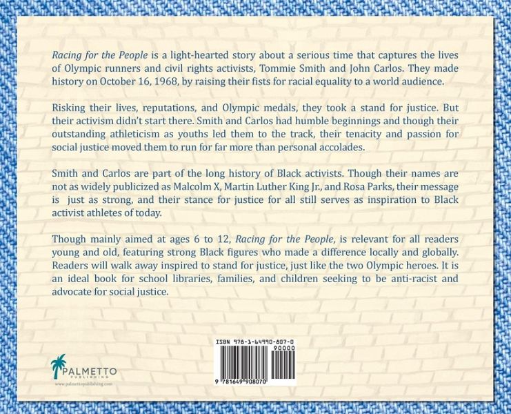 Racing for the People is a light-hearted story about a serious time that captures the lives of Olympic runners and civil rights activists, Tommie Smith and John Carlos. They made history on October 16, 1968, by raising their fists for racial equality to a world audience. Risking their lives, reputations, and Olympic medals, they took a stand for justice. But their activism didn't start there. Smith and Carlos had humble beginnings and though their outstanding athleticism as youths led them to the track, their tenacity and passion for social justice moved them to run for far more than personal accolades. Smith and Carlos are part of a long history of Black activists. Though their names are not as widely publicized as Malcolm X, Martin Luther King Jr., and Rosa Parks, their message is just as strong, and their stance for justice for all continues to serve as inspiration to the Black activist athletes of today. Though mainly aimed at ages 6 to 12, Racing for the People, is relevant for all readers young and old, featuring strong Black figures who made a difference locally and globally. Readers will walk away inspired to stand for justice, just like the two Olympic heroes. It is an ideal book for school libraries, families, and children seeking to be anti-racist and advocate for social justice.