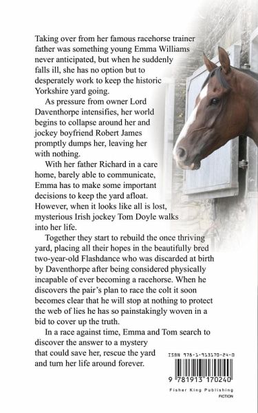 Taking over from her famous racehorse trainer father was something young Emma Williams never anticipated, but when he suddenly falls ill, she has no option but to desperately work to keep the historic Yorkshire yard going. As pressure from owner Lord Daventhorpe intensifies, her world begins to collapse around her and jockey boyfriend Robert James promptly dumps her, leaving her with nothing. With her father Richard in a care home, barely able to communicate, Emma has to make some important decisions to keep the yard afloat. However, when it looks like all is lost, mysterious Irish jockey Tom Doyle walks into her life. Together they start to rebuild the once thriving yard, placing all their hopes in the beautifully bred two-year-old Flashdance who was discarded at birth by Daventhorpe after being considered physically incapable of ever becoming a racehorse. When he discovers the pair's plan to race the colt it soon becomes clear that he will stop at nothing to protect the web of lies he has so painstakingly woven in a bid to cover up the truth. In a race against time, Emma and Tom search to discover the answer to a mystery that could save her, rescue the yard and turn her life around forever.