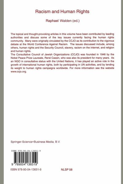 The topical and thought-provoking articles in this volume have been contributed by leading authorities and discuss some of the key issues currently facing the human rights community. Many were originally circulated by the CCJO as its contribution to the vigorous debate at the World Conference Against Racism. The issues discussed include, among others, human rights and the Security Council, slavery, racism on the internet, and religion and human rights. The Consultative Council of Jewish Organizations (CCJO) was founded in 1946 by the Nobel Peace Prize Laureate, Rene Cassin, who was also its president for many years. As an NGO in consultative status with the United Nations, it has played an active role in the growth of international human rights, both by participating in UN activities, and by lending its weight to human rights campaigns worldwide. For more information see the website www.ccjo.org.