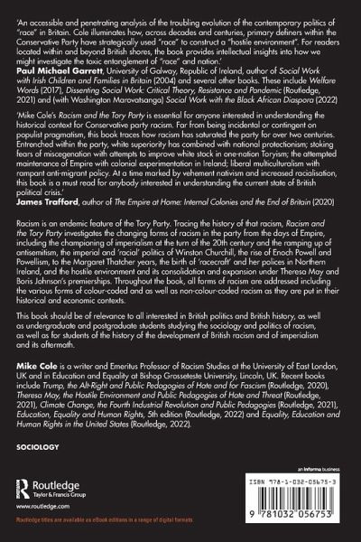 'Mike Cole's Racism and the Tory Party is essential for anyone interested in understanding the historical context for Conservative party racism. Far from being incidental or contingent on populist pragmatism, this book traces how racism has saturated the party for over two centuries. Entrenched within the party, white superiority has combined with national protectionism; stoking fears of miscegenation with attempts to improve white stock in one-nation Toryism; the attempted maintenance of Empire with colonial experimentation in Ireland; liberal multiculturalism with rampant anti-migrant policy. At a time marked by vehement nativism and increased racialisation, this book is a must read for anybody interested in understanding the current state of British political crisis.'