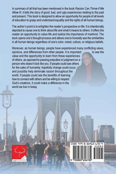 In summary of all that has been mentioned in the book Racism Can Thrive if We Allow It, it tells the story of good, bad, and ugly experiences relating to the past and present. This book is designed to allow an opportunity for people of all levels of education to grasp and understand equality and the rights of all human beings. The author's point is to enlighten the reader's perspective on life. It is intentionally depicted to cause one to think about life and what it means to others. It offers the reader an opportunity to value life and realize the importance of mankind. The book opens one's thought process and allows one to honestly see the similarities in all human beings regardless of one's color, creed, culture, or religious beliefs. Moreover, as human beings, people have experienced many conflicting views, opinions, and differences from other people. It is important to see the value and the opportunity to learn from these experiences of others, as opposed to passing prejudice or judgment on a person who doesn't look like you. If people could see others for the sake of humanity, hopefully change could occur and possibly help eliminate racism throughout the world. If people could see the benefits of learning how to connect with others and be willing to respect God's creations, it could make a difference in the world we live in today.