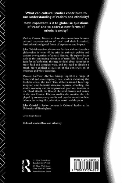 Racism, Culture, Markets explores the connections between cultural representations of `race' and their historical, institutional and global forms of expression and impact. John Gabriel examines the current fixation with market place philosophies in terms of the crisis in anti-racist politics and concern over questions of cultural identity. He explores issues such as the continuing relevance of terms like `black' as a basis for self definition; the need to think about identities in more fluid and complex ways, and the need to develop a much more explicit discussion of the construction of whiteness and white identities. Racism, Culture, Markets brings together a range of historical and contemporary case studies including the Rushdie affair; the Gulf War; debates around fostering, adoption and domestic violence; separate schooling; the service economy and its employment practices; tourism in the Third World; the Bhopal chemical disaster and racism in the new Europe. His case studies also consider the role played by contemporary media and popular culture in these debates, including film, television, music and the press.