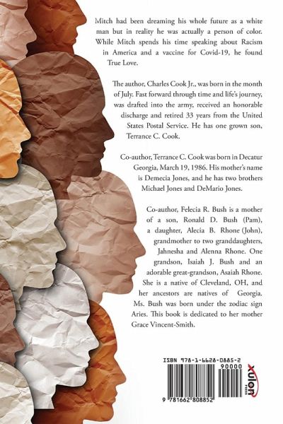 Mitch had been dreaming his whole future as a white man but in reality he was actually a person of color. While Mitch spends his time speaking about Racism in America and a vaccine for Covid-19, he found True Love. The author, Charles Cook Jr., was born in the month of July. Fast forward through time and life's journey, was drafted into the army, received an honorable discharge and retired 33 years from the United States Postal Service. He has one grown son, Terrance C. Cook. Co-author, Terrance C. Cook was born in Decatur Georgia, March 19, 1986. His mother's name is Demecia Jones, and he has two brothers Michael Jones and DeMario Jones. Co-author, Felecia R. Bush is a mother of a son, Ronald D. Bush (Pam), a daughter, Alecia B. Rhone(John), grandmother to two granddaughters, Jahnesha and Alenna Rhone. One grandson, Isaiah J. Bush and an adorable great-grandson, Asaiah Rhone. She is a native of Cleveland, OH, and her ancestors are natives of Georgia. Ms. Bush was born under the zodiac sign Aries. This book is dedicated to her mother Grace Vincent-Smith.
