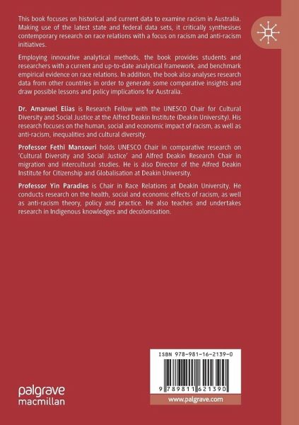 This book focuses on historical and current data to examine racism in Australia. Making use of the latest state and federal data sets, it critically synthesises contemporary research on race relations with a focus on racism and anti-racism initiatives. Employing innovative analytical methods, the book provides students and researchers with a current and up-to-date analytical framework, and benchmark empirical evidence on race relations. In addition, the book also analyses research data from other countries in order to generate some comparative insights and draw possible lessons and policy implications for Australia.…mehr