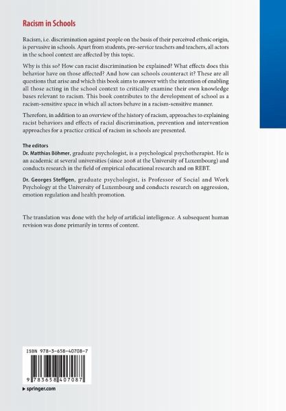 Therefore, in addition to an overview of the history of racism, approaches to explaining racist behavior and the effects of racist discrimination, prevention and intervention approaches for a practice critical of racism in schools are presented.