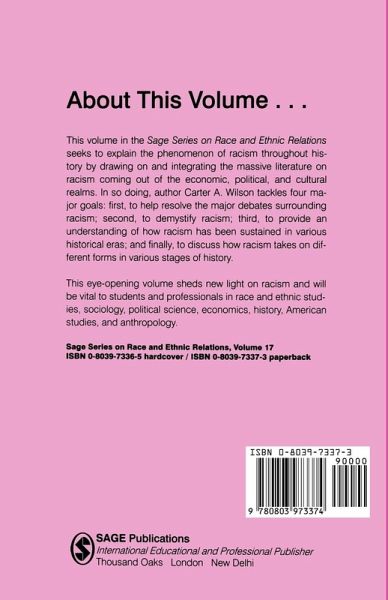 An explanation of the phenomenon of racism throughout history is sought in this book. Carter A Wilson draws on and integrates the considerable literature on racism which has originated from economic, political and cultural realms. In doing so he addresses four major goals: to resolve the major debates surrounding racism; to demystify racism; to provide an understanding of how racism has been sustained in various historical eras; and to discuss how racism takes on different forms throughout history.
