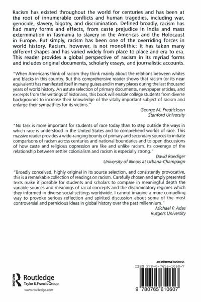 Racism has existed throughout the world for centuries and has been at the root of innumerable conflicts and human tragedies, including war, genocide, slavery, bigotry, and discrimination. Defined broadly, racism has had many forms and effects, from caste prejudice in India and mass extermination in Tasmania to slavery in the Americas and the Holocaust in Europe. Put simply racism has been one of the overriding forces in world history for more than a millennium. This book provides a global perspective of racism in its myriad forms. Consisting of 12 parts and 51 articles, it focuses on racism worldwide over the past thousand years. It includes three types of articles: original documents, scholarly essays, and journalistic accounts.