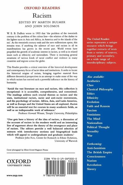 W. E. B. DuBois wrote in 1903 that `the problem of the twentieth century is the problem of the colour line - the relation of the darker to the lighter races in Asia and Africa, in America and in the islands of the sea'. As the century draws to its close, this remains true; if anything the salience of race and racism in all its manifestations has grown in the recent past. The last few years have witnessed a growth in academic interest in racism, and in related issues such as nationalism and ethnicity, as well as an increasing general awareness of various kinds of racial conflict and violence in a range of countries and regions across the globe. This Reader provides a critical overview of the historical development and contemporary forms of racist ideas and institutions. It brings together material from different theoretical perspectives in an attempt to make sense of the way in which racism has exerted such a powerful influence on the history of humanity.