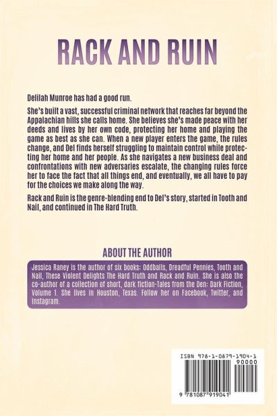 Delilah Monroe has had a good run. She's built a vast, successful criminal network that reaches far beyond the Appalachian hills she calls home. She believes she's made peace with her deeds and lives by her own code, protecting her home and playing the game as best as she can. When a new player enters the game, the rules change, and Del finds herself struggling to maintain control while protecting her home and her people. As she navigates a new business deal and confrontations with new adversaries escalate, the changing rules force her to face the fact that all things end, and eventually, we all have to pay for the choices we make along the way. Rack and Ruin is the genre-blending end to Del's story, started in Tooth and Nail, and continued in The Hard Truth.
