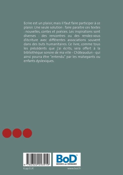 Ecrire est un plaisir, mais il faut faire participer à ce plaisir. Une seule solution : faire paraitre ces textes : nouvelles, contes et poésies. Les inspirations sont diverses : des rencontres ou des rendez-vous d'écriture avec différentes associations souvent dans des buts humanitaires. Ce livre, comme tous les précédents que j'ai écrits, sera offert à la bibliothèque sonore de ma ville - Châteaudun - qui ainsi pourra être "entendu" par les malvoyants ou enfants dyslexiques.
