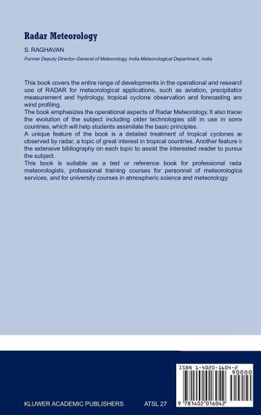 As we all know, weather radar came into existence during the Second World War when aircraft detection radars had their vision limited by echoes from rain bearing clouds. What was often considered to be of nuisance value by the air force personnel trying to locate enemy aircraft was seen as an opportunity by the weather men. Thus adversity in one field was converted into an opportunity in another. Since then weather radar has found myriad applications with the increased sophistication of technology and processing systems. It has now become an indispensable tool for the operational forecasters, cloud physicists and atmospheric scientists. The current generation radar is but a distant echo of the radars of the 1940s. As a result, its operation and maintenance have become very complex, like the technology it uses. Therefore, there is a definite requirement of focussing our special attention not only on the science of radar meteorology but also on its operational aspects. The present book,as pointed out by the author, attempts to fill this gap. The author has presented the subject with a balanced blend of science, technology and practice. The canvas is indeed very broad. Starting with the history of weather radar development the book goes on to discuss in a lucid style the physics of the atmosphere related to radar observation, radar technology, echo interpretation, different applications and finally attempts to look into the future to indicate potential new opportunities in this field.
