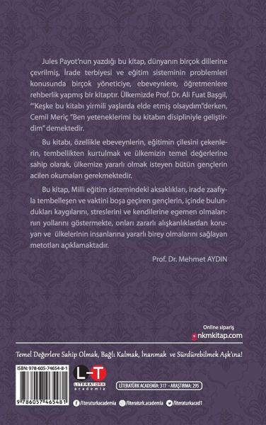 Jules Payot'nun yazd¿¿¿ bu kitap, dünyan¿n birçok dillerine çevrilmi¿, ¿rade terbiyesi ve e¿itim sisteminin problemleri konusunda birçok yöneticiye, ebeveynlere, ö¿retmenlere rehberlik yapm¿¿ bir kitapt¿r. Ülkemizde Prof. Dr.Ali Fuat Bägil, "'Ke¿ke bu kitab¿ yirmili yälarda elde etmi¿ olsayd¿m''derken, Cemil Meriç ''Ben yeteneklerimi bu kitab¿n disipliniyle geli¿tirdim'' demektedir. Bu kitab¿, özellikle ebeveynlerin, e¿itimin çilesini çekenlerin, tembellikten kurtulmak ve ülkemizin temel de¿erlerine sahip olarak, ülkemize yararl¿ olmak isteyen bütün gençlerin acilen okumalar¿ gerekmektedir. Bu kitap, Milli e¿itim sistemindeki aksakl¿klar¿, irade zaaf¿yla tembelle¿en ve vaktini bo¿a geçiren gençlerin, içinde bulunduklar¿ kayg¿lar¿n¿, streslerini ve kendilerine egemen olmalar¿n¿n yollar¿n¿ göstermekte, onlar¿ zararl¿ al¿¿kanl¿klardan koruyan ve ülkelerinin insanlar¿na yararl¿ birey olmalar¿n¿ sälayan metotlar¿ aç¿klamaktad¿r..