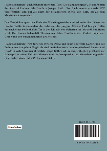 "Radetzkymarsch", auch bekannt unter dem Titel "Die Kapuzinergruft", ist ein Roman des österreichischen Schriftstellers Joseph Roth. Das Buch wurde erstmals 1932 veröffentlicht und gilt als eines der bekanntesten Werke von Roth, oft als sein Meisterwerk angesehen. Die Geschichte spielt am Ende des Habsburgerreichs und erkundet das Leben der Familie Trotta, insbesondere das Schicksal des jungen Offiziers Carl Joseph Trotta, der nach einer heldenhaften Tat in der Schlacht von Solferino im Jahr 1859 nobilitiert wird. Der Roman behandelt Themen wie Erbe, Tradition, den Verlust imperialer Größe und den Zusammenbruch des Reiches. "Radetzkymarsch" wird für seine lyrische Prosa und seine kraftvolle Darstellung des Endes einer Ära gelobt. Er gilt als ein klassisches Werk der europäischen Literatur und wurde in viele Sprachen übersetzt. Joseph Roth wird für seine Fähigkeit geschätzt, die Atmosphäre seiner Zeit einzufangen und die Komplexität der Menschen angesichts einer sich verändernden Welt auszudrücken.