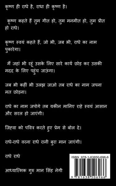 krshn hee raadhe hai, raadha hee krshn hai. krshn kahate hain tum geet ho, tum manameet ho, tum preet ho raadhe. krshn svayan kahate hain, jo bhee, jab bhee, raadhe ka naam pukaarega. main jahaan bhee rahoon usake lie saare kaary chhod kar usakee madad ke lie pahunch jaoonga. jab bhee kaheen bhee ulajh jao tab raadhe ka naam japana mat chhodana. raadhe ka naam japoge tab yakeen maanie raahe svayan aasaan aur saral ho jaengee. jihva ko pavitr karate hue prem se bol de. raadhe-raadhe varana raadhe raanee bura maan jaengee. raadhe raadhe