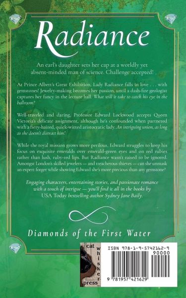 An earl's daughter sets her cap at a worldly yet absent-minded man of science. Challenge accepted! At Prince Albert's Great Exhibition, Lady Radiance falls in love . . . with gemstones! Jewelry-making becomes her passion, until a dash-fire geologist captures her fancy in the lecture hall. What will it take to catch his eye in the ballroom?Well-traveled and daring, Professor Edward Lockwood accepts Queen Victoria's delicate assignment, although he's confounded when partnered with a fiery-haired, quick-witted aristocratic lady. An intriguing union, as long as she doesn't distract him!While the royal mission grows more perilous, Edward struggles to keep his focus on exquisite emeralds over emerald-green eyes and on red rubies rather than lush, ruby-red lips. But Radiance wasn't raised to be ignored. Amongst London's skilled jewelers - and treacherous thieves - can she unmask an expert forger while showing Edward she's more precious than any gemstone? Engaging characters, entertaining stories, and passionate romance with a touch of intrigue - you'll find it all in the books by USA Today bestselling author Sydney Jane Baily.