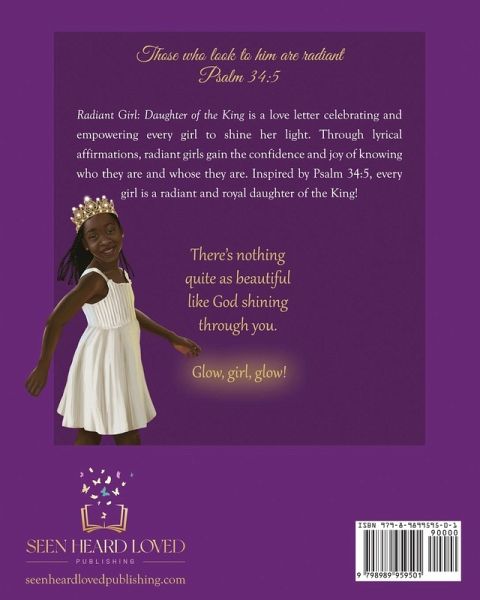 Radiant Girl: Daughter of the King is a love letter celebrating and empowering every girl to shine her light. Through lyrical affirmations, radiant girls gain the confidence and joy of knowing who they are and whose they are. Inspired by Psalm 34:5, every girl is a radiant and royal daughter of the King! There's nothing quite as beautiful like God shining through you. Glow, girl, glow