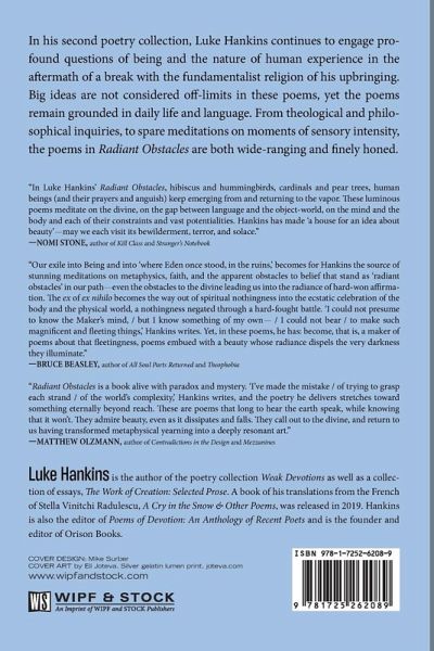 In his second poetry collection, Luke Hankins continues to engage profound questions of being and the nature of human experience in the aftermath of a break with the fundamentalist religion of his upbringing. Big ideas are not considered off-limits in these poems, yet the poems remain grounded in daily life and language. From theological and philosophical inquiries, to spare meditations on moments of sensory intensity, the poems in Radiant Obstacles are both wide-ranging and finely honed.