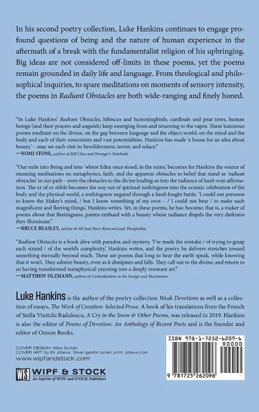 In his second poetry collection, Luke Hankins continues to engage profound questions of being and the nature of human experience in the aftermath of a break with the fundamentalist religion of his upbringing. Big ideas are not considered off-limits in these poems, yet the poems remain grounded in daily life and language. From theological and philosophical inquiries, to spare meditations on moments of sensory intensity, the poems in Radiant Obstacles are both wide-ranging and finely honed.