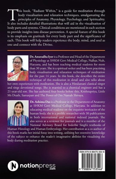 This book, "Radiant Within," is a guide for meditation through body visualisation and relaxation techniques, amalgamating the principles of Anatomy, Physiology, Psychology, and Spirituality. It also includes detailed illustrations that will aid in the visualisation of body parts and systems. Clinical conditions are mentioned in each section to provide insights into disease prevention. A special feature of this book is its emphasis on gratitude for every body part and the significance of each. This book will help readers experience the body, mind, and soul as one and connect with the Divine.