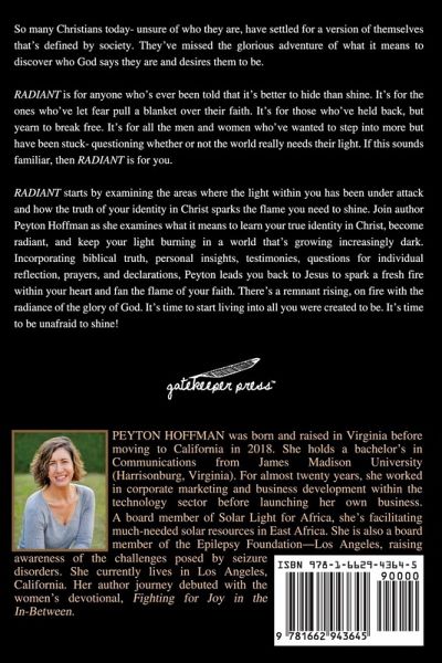 So many Christians today- unsure of who they are, have settled for a version of themselves that's defined by society. They've missed the glorious adventure of what it means to discover who God says they are and desires them to be. RADIANT is for anyone who's ever been told that it's better to hide than shine. It's for the ones who've let fear pull a blanket over their faith. It's for those who've held back, but yearn to break free. It's for all the men and women who've wanted to step into more but have been stuck- questioning whether or not the world really needs their light. If this sounds familiar, then RADIANT is for you. RADIANT starts by examining the areas where the light within you has been under attack and how the truth of your identity in Christ sparks the flame you need to shine. Join author Peyton Hoffman as she examines what it means to learn your true identity in Christ, become radiant, and keep your light burning in a world that's growing increasingly dark. Incorporating biblical truth, personal insights, testimonies, questions for individual reflection, prayers, and declarations, Peyton leads you back to Jesus to spark a fresh fire within your heart and fan the flame of your faith. There's a remnant rising, on fire with the radiance of the glory of God. It's time to start living into all you were created to be. It's time to be unafraid to shine!