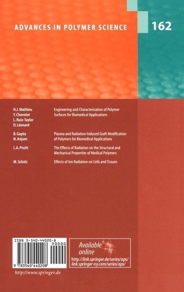 Biomaterials repair, reinforce or replace damaged functional parts of the (human) body. All mechanical and biological interactions between an implant and the body occur across the interface, which has to correspond as nearly as possible to its particular function. Much of the progress in adapting polymer materials for use in a biological environment has been obtained through irradiation techniques. For this reason the most recent developments in four key areas are reviewed in this special volume: (1) the analysis of the topology and the elemental composition of a functional surface, (2) the chemical modification of the surface which results in highly pure, sterile and versatile surfaces, (3) the sterilisation of implantable devices via ionising radiation and its possible effects on the structural mechanical properties of polymers, and (4) the radiation effects on living cells and tissues which are of particular importance for radiation protection and radiotherapy.