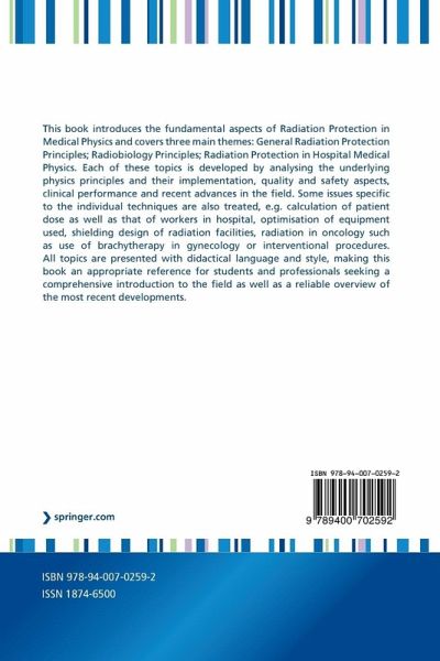 This book introduces the fundamental aspects of Radiation Protection in Medical Physics and covers three main themes: General Radiation Protection Principles; Radiobiology Principles; Radiation Protection in Hospital Medical Physics. Each of these topics is developed by analysing the underlying physics principles and their implementation, quality and safety aspects, clinical performance and recent advances in the field. Some issues specific to the individual techniques are also treated, e.g. calculation of patient dose as well as that of workers in hospital, optimisation of equipment used, shielding design of radiation facilities, radiation in oncology such as use of brachytherapy in gynecology or interventional procedures. All topics are presented with didactical language and style, making this book an appropriate reference for students and professionals seeking a comprehensive introduction to the field as well as a reliable overview of the most recent developments.