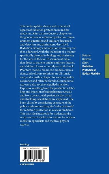 This book explains clearly and in detail all aspects of radiation protection in nuclear medicine, including measurement quantities and units, detectors and dosimeters, and radiation biology. Discussion of radiation doses to patients and to embryos, fetuses, and children forms a central part of the book. Phantom models, biokinetic models, calculations, and software solutions are all considered, and a further chapter is devoted to quality assurance and reference levels. Occupational exposure also receives detailed attention. Exposure resulting from the production, labeling, and injection of radiopharmaceuticals and from contact with patients is discussed and shielding calculations are explained. The book closes by considering exposure of the public and summarizing the "rules of thumb" for radiation protection in nuclear medicine. This is an ideal textbook for students and a ready source of useful information for nuclear medicine specialists and medical physics experts.