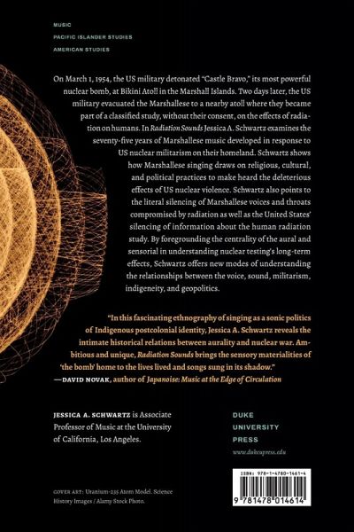 On March 1, 1954, the US military detonated "Castle Bravo," its most powerful nuclear bomb, at Bikini Atoll in the Marshall Islands. Two days later, the US military evacuated the Marshallese to a nearby atoll where they became part of a classified study, without their consent, on the effects of radiation on humans. In Radiation Sounds Jessica A. Schwartz examines the seventy-five years of Marshallese music developed in response to US nuclear militarism on their homeland. Schwartz shows how Marshallese singing draws on religious, cultural, and political practices to make heard the deleterious effects of US nuclear violence. Schwartz also points to the literal silencing of Marshallese voices and throats compromised by radiation as well as the United States' silencing of information about the human radiation study. By foregrounding the centrality of the aural and sensorial in understanding nuclear testing's long-term effects, Schwartz offers new modes of understanding the relationships between the voice, sound, militarism, indigeneity, and geopolitics.