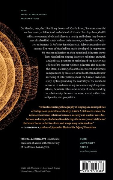 On March 1, 1954, the US military detonated "Castle Bravo," its most powerful nuclear bomb, at Bikini Atoll in the Marshall Islands. Two days later, the US military evacuated the Marshallese to a nearby atoll where they became part of a classified study, without their consent, on the effects of radiation on humans. In Radiation Sounds Jessica A. Schwartz examines the seventy-five years of Marshallese music developed in response to US nuclear militarism on their homeland. Schwartz shows how Marshallese singing draws on religious, cultural, and political practices to make heard the deleterious effects of US nuclear violence. Schwartz also points to the literal silencing of Marshallese voices and throats compromised by radiation as well as the United States' silencing of information about the human radiation study. By foregrounding the centrality of the aural and sensorial in understanding nuclear testing's long-term effects, Schwartz offers new modes of understanding the relationships between the voice, sound, militarism, indigeneity, and geopolitics.