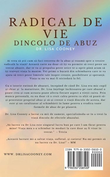 Ai vrea s¿ ¿tii cum s¿ faci trecerea de la abuz ¿i traum¿ spre o trezire radical¿ la viä¿? Aceast¿ carte nu doar c¿ î¿i va permite s¿ treci peste un trecut abuziv, dar te va ¿i propulsa peste orice te-a oprit pân¿ acum s¿ î¿i traie¿ti viäa la maxim. Vei primi o bucat¿ din schimbarea care te va ajuta s¿ treci peste limitele tale înspre creäie, posibilitate ¿i speran¿¿. Viäa ta nu va mai fi niciodat¿ la fel.Cu o istorie extins¿ de abuzuri, începând de când Dr. Lisa era mic copil ¿i chiar ¿i la maturitate, Dr. Lisa în¿elege închisoarea pe care abuzul o poate crea ¿i cum aceasta poate afecta fiecare aspect a vie¿ii cuiva. Prin munca personal¿, ea nu doar c¿ a croit calea pentru ca al¿ii s¿ poat¿ s¿-¿i proceseze propriul abuz ¿i s¿-¿i creeze o viä¿ dincolo de acesta, dar este ¿i un catalizator al schimb¿rii în lume pentru a eradica toate formele de abuz de pe planet¿.Dr. Lisa Cooney a lucrat cu mii de oameni, specializându-se în a trezi la viä¿ dincolo de efectele abuzului."S¿ lucrez cu Dr Lisa este singurul lucru bun pe care l-am f¿cut pentru mine! Viäa mea s-a schimbat în moduri la care doar ä fi visat în trecut." - Tricia"Aceast¿ lucrare mi-a salvat viäa, sufletul, ¿i cariera! Nu-mi permit s¿ nu lucrez cu Dr. Lisa!" - MMCunoscut¿ ca un tsunami al schimb¿rii; abordarea sa de neclintit vizavi de limitele care paralizeaz¿, inhib¿ ¿i ne distrug vie¿ile, este diferit¿ fä¿ de a oric¿rei alte persoane sau al oric¿rui alt sistem. Ea este cu certitudine unic¿ ¿i aproape dincolo de orice imaginäie în capacitatea ei de a facilita, crea ¿i a ne atrage pe noi töi în a alege viäa pe care o dorim cu adev¿rat." - Amy Cristol Hirsch WWW. DRLISACOONEY.COMDr. Lisa Cooney, terapeut licen¿iat în terapia de familie ¿i cuplu, maestru in vindecarea theta, facilitator certificat Access Consciousness, este creatorul Traieste-¿i Racnetul! Fii tu! Dincolo de Orice! Creând Magie! (Live Your Roar! Be You! Beyond Anything! Creating Magic!) Transformându-¿i propria viä¿ de la abuz ¿i înfrângere la un teren de joac¿ virtual plin de minuni ¿i bucurie, Dr. Lisa împ¿rt¿¿e¿te cu generozitate darurile sale ¿i instrumente creative pentru transformare. Ea îi invit¿ ¿i îi ghideaz¿ pe ceilal¿i dincolo de obstacole într-un loc al propriei lor cunoäteri.. acel späiu unde au acces direct la ¿oaptele con¿tiin¿ei.