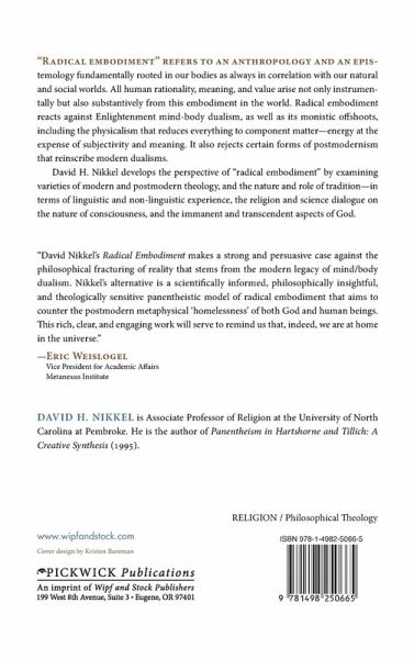 ""Radical embodiment"" refers to an anthropology and an epistemology fundamentally rooted in our bodies as always in correlation with our natural and social worlds. All human rationality, meaning, and value arise not only instrumentally but also substantively from this embodiment in the world. Radical embodiment reacts against Enlightenment mind-body dualism, as well as its monistic offshoots, including the physicalism that reduces everything to component matter-energy at the expense of subjectivity and meaning. It also rejects against certain forms of postmodernism that reinscribe modern dualisms. David H. Nikkel develops the perspective of ""radical embodiment"" by examining varieties of modern and postmodern theology, and the nature and role of tradition-in terms of linguistic and non-linguistic experience, the religion and science dialogue on the nature of consciousness, and the immanent and transcendent aspects of God.