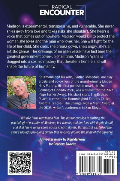 She's experimental, transgressive, and vulnerable. Madison never turns away from love, takes risks she shouldn't, and hears a Voice that comes out of nowhere. She would kill to protect the woman she loves and the man who loves her. Her child is everything. No one will take her away without a fight. She cries, she breaks down, she's angry, she's an artistic genius. Madison Ayana is dragged into a cosmic mystery that will change the future of humanity. Her drawings of an alien spacecraft have unwittingly laid bare the greatest government cover-up of all time. Revealing her source will shatter her life. Even under interrogation, she will not talk about voices she hears. She would be labeled crazy. Fearful and untrusting, her only hope is the lead agent who risks her career and her heart to become an unlikely ally. Madison is the key to understanding why an alien race would traverse the Milky Way to visit humanity. When a hacker group floods the internet with her alien vessel sketches, the two become tangled in politics and public hysteria. An FBI investigation lands them on the most wanted list. Branded as spies from outer space by conspiracists, and pursued by authorities, their intimate bond shapes their future as they struggle to survive the lies that spread across social media. Their only hope is to find the one scientist who believes her visions are real and will change the course of human history. What Madison sees is far greater than an alien spacecraft heading toward Earth. As the stakes escalate, she must confront her humanity, her ability to love, and her willingness to sacrifice. When the spherical object hedges closer to our planet, the fate of humanity hangs in the balance. Madison holds the brush that could write the Earth's future. These highly advanced space travelers have a very personal reason for coming.