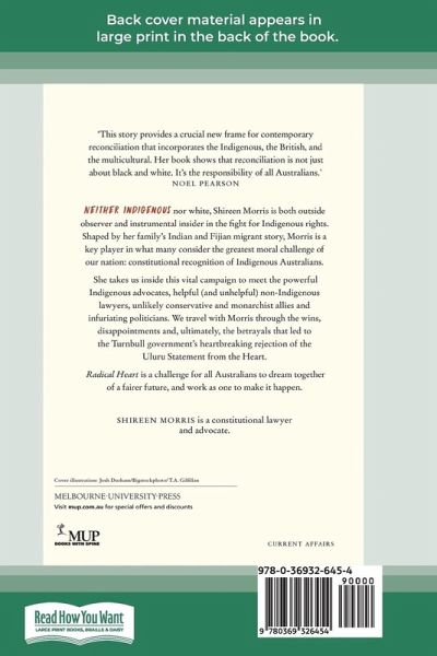 Neither Indigenous nor white, Shireen Morris is both outside observer and instrumental insider in the fight for Indigenous rights. Shaped by her family's Indian and Fijian migrant story, Morris is a key player in what many consider the greatest moral challenge of our nation: constitutional recognition of Indigenous Australians. She takes us inside this vital campaign to meet the powerful Indigenous advocates, helpful (and unhelpful) non-Indigenous lawyers, unlikely conservative and monarchist allies and infuriating politicians. We travel with Morris through the wins, disappointments and, ultimately, the betrayals that led to the Turnbull government's heartbreaking rejection of the Uluru Statement from the Heart. Radical Heart is a challenge for all Australians to dream together of a fairer future, and work as one to make it happen.
