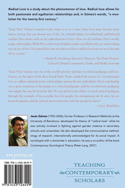 «Jesús 'Pato' Gómez's seminal work comes to us at a time when love must become more than a notion, but our chosen way of life. As a friend, father, lover/husband, and beloved teacher, Pato shares with us his radicalization of love. How we all celebrate Pato's words, songs, and insights. With Pato, colors were brighter, music was filled with joy, and teaching was an act of love. He enacted his own revolution of love, and his book moves us to become all we can be.» (Shirley R. Steinberg, Executive Director, The Freire Project: Critical Cultural Community, Youth, and Media Activism)