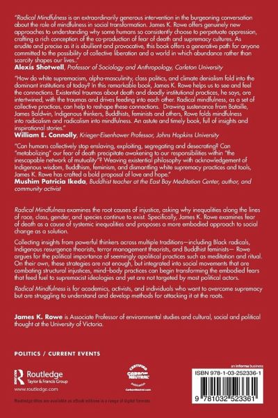 "How do white supremacism, alpha-masculinity, class politics, and climate denialism fold into the dominant institutions of today? In this remarkable book, James K. Rowe helps us to see and feel the connections. Existential traumas about death and deadly institutional practices, he says, are intertwined, with the traumas and drives feeding into each other. Radical mindfulness, as a set of collective practices, can help to reshape these connections. Drawing sustenance from Bataille, James Baldwin, Indigenous thinkers, Buddhists, feminists and others, Rowe folds mindfulness into radicalism and radicalism into mindfulness. An astute and timely book, full of insights and inspirational stories."