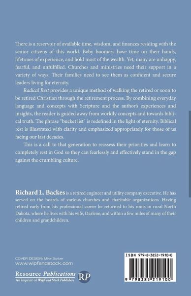 There is a reservoir of available time, wisdom, and finances residing with the senior citizens of this world. Baby boomers have time on their hands, lifetimes of experience, and hold most of the wealth. Yet, many are unhappy, fearful, and unfulfilled. Churches and ministries need their support in a variety of ways. Their families need to see them as confident and secure leaders living for eternity. Radical Rest provides a unique method of walking the retired or soon to be retired Christian through the retirement process. By combining everyday language and concepts with Scripture and the author's experiences and insights, the reader is guided away from worldly concepts and towards biblical truth. The phrase ""bucket list"" is redefined in the light of eternity. Biblical rest is illustrated with clarity and emphasized appropriately for those of us facing our last decades. This is a call to that generation to reassess their priorities and learn to completely rest in God so they can fearlessly and effectively stand in the gap against the crumbling culture.