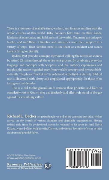 There is a reservoir of available time, wisdom, and finances residing with the senior citizens of this world. Baby boomers have time on their hands, lifetimes of experience, and hold most of the wealth. Yet, many are unhappy, fearful, and unfulfilled. Churches and ministries need their support in a variety of ways. Their families need to see them as confident and secure leaders living for eternity. Radical Rest provides a unique method of walking the retired or soon to be retired Christian through the retirement process. By combining everyday language and concepts with Scripture and the author's experiences and insights, the reader is guided away from worldly concepts and towards biblical truth. The phrase ""bucket list"" is redefined in the light of eternity. Biblical rest is illustrated with clarity and emphasized appropriately for those of us facing our last decades. This is a call to that generation to reassess their priorities and learn to completely rest in God so they can fearlessly and effectively stand in the gap against the crumbling culture.