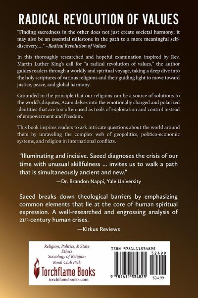 "Even in the midst of today's global concerns, this book provides a sense of hope and future. A must-read for business executives who desire to be responsible citizens and leaders." -Idris T Vasi, Head of Nokia CNS - Asia-Pacific "Finding sacredness in the other does not just create societal harmony, it may also be an essential milestone in the path to a more meaningful self-discovery..." -Radical Revolution of Values In this thoroughly researched and hopeful examination inspired by Rev. Martin Luther King's call for "a radical revolution of values," the author guides readers through a worldly and spiritual voyage, taking a deep dive into the holy scriptures of various religions and their guiding light to move toward justice, peace, and global harmony. Grounded in the principle that our religions can be a source of solutions towards the world's disputes, Azam delves into the emotionally charged and polarized identities that are too often used as tools of exploitation and control instead of empowerment and freedom. This book inspires readers to ask intricate questions about the world around them by unraveling the complex web of geopolitics, politico-economic systems, and religion in international conflicts. What People are Saying: "Radical Revolution of Values is a scholarly book but its message of love, compassion, justice, and inclusion, which is much-needed today, is for all people." -Dr. Riffat Hassan, Professor Emerita, Islamic Theology, University of Louisville "Azam Saeed has tackled big topics we all confront today in our divided culture: religious exploitation, tribalism, threats to our freedom, domestic terrorism. He skillfully dissects these and provides solutions in clear, easy-to-understand language." -Cynthia Parzych. Author and Book Publisher, Cynthia Parzych Publishing, Inc. "An excellent resource for helping us understand the backstory to the major socio-political and religious issues of today." -Miriam Therese Winter, PhD, Medical Mission Sister, Professor Emerita, Hartford International University for Religion and Peace