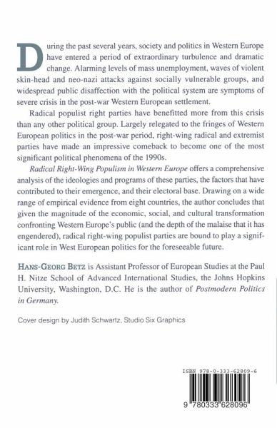 Studies the new West European parties of the radical populist right, arguing that, in distancing themselves from the reactionary politics of the traditional extremist right, these parties have become a significant challenge to the established structure and politics of West European democracy today.