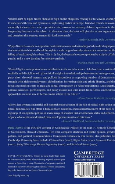 "Norris has written a masterful and comprehensive account of the rise of radical right voting in liberal democracies. She offers a dispassionate, scientific, and nuanced treatment of the perplexing surge of xenophobic politics in a wide range of societies that are otherwise stable and affluent. Anyone who wants to understand these developments must read this book." James Hollifield, Southern Methodist University