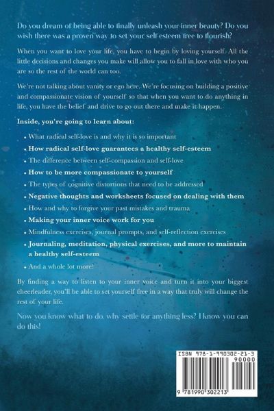 ream of being able to finally unleash your inner beauty? Wish there was a proven way to set your self-esteem free to flourish? When you want to love your life, you have to begin by loving yourself. All the little decisions and changes you make will allow you to fall in love with who you are so that the rest of the world can too. We're not talking about vanity or ego here. We're focusing on building a positive and compassionate vision of yourself so that when you want to do anything in life, you have the belief and drive to go out there and make it happen. The problem is that finding a way to do all of this is so much easier said than done. That's why I want to tell you that... ...you CAN do more than you ever thought possible if you just keep reading! "Radical Self Love and Compassion Workbook" is for anyone who's ready to lift themselves up in an empowering and engaging way that's all about living life on your own terms. Inside Radical Self Love and Compassion Workbook, you're going to learn about: What radical self-love is and why it is so important How radical self-love guarantees a healthy self-esteem The difference between self-compassion and self-love How to be more compassionate to yourself The types of cognitive distortions Negative thoughts and worksheets focused on dealing with them How and why to forgive your past mistakes and trauma Making your inner voice work for you Mindfulness exercises, journal prompts, and self-reflection exercises Journaling, meditation, physical exercises, and more to maintain a healthy self-esteem And a whole lot more! By finding a way to listen to your inner voice and turn it into your biggest cheerleader, you'll be able to set yourself free in a way that truly will change the rest of your life. How do I know this is possible? Because I know your copy is ready and waiting at the top of this page! Make this the moment you reach out, take it and commit to reading it. In the next 30 seconds you can take massive action that will allow you to manifest self-love in a way that changes everything. Now you know what to do, why settle for anything less? I know you can do this!