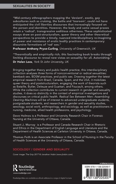 Foreword [Winston Gieseke] Introduction: RadSex in Theory and in Practice [Stuart J. Murray Dave Holmes and Thomas Foth] Part I: Bareback Sex 1. Brothers-in-Cum: A Critical Discourse Analysis of Barebacking Rhetoric [Dave Holmes Chad Hammond and Mathieu Mercier] 2. Mediated Intimacies: Raw Sex Truvada and the Biopolitics of Chemoprophylaxis [Tim Dean] 3. "Not Only Macho-fuckers are Barebackers": Challenging Gender Relations among Men who Have Sex with Men [Angel Gasch] 4. The Anatomy of a Forbidden Desire: Men Penetration and Semen Exchange [Dave Holmes and Dan Warner] PART II: BDSM Practices 5. BDSM Sexual Subcultures and the Ethics of Public Health Discourse [Dave Holmes Stuart J. Murray Natasha Knack Mathieu Mercier and J. Paul Fedoroff] 6. Degenitalizing the Sexual: BDSM Practices and the Deterriorialization of Bodies [Dave Holmes Stuart J. Murray Natasha Knack Mathieu Mercier and J. Paul Fedoroff] 7. Fucking with Fluids and Wet with Desire: Power and Humiliation using Cum Piss and Blood [Jeremy Thomas and DJ Williams] PART III: Public Sex 8. Transgressive Assemblages: An Ethnography of Gay Group Sex [Dave Holmes Patrick O'Byrne Stuart J Murray Chad Hammond and Mathieu Mercier] 9. Faceless Sex: Glory Holes and Sexual Assemblages [Dave Holmes Patrick O'Byrne and Stuart J. Murray] 10. Profiling Postmodern Public Sex: How Grindr Revolutionized the Face of Gay Cruising [Matthew Numer Dave Holmes Phillip Joy and Ryan Thompson] 11. Secret Desires: Masculinities in the Era of Network Relations [Luiz Felipe Zago Larissa Pelucio and Richard Miskolci]