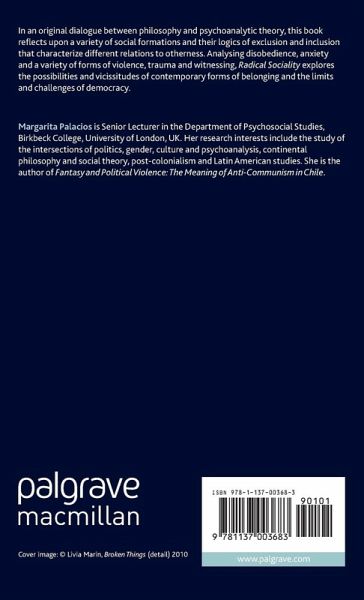 Margarita Palacios is Senior Lecturer in the Department of Psychosocial Studies, Birkbeck College, University of London, UK. Her research interests include the study of the intersections of politics, gender, culture and psychoanalysis, continental philosophy and social theory, post-colonialism and Latin American studies. She is the author of Fantasy and Political Violence: The Meaning of Anti-Communism in Chile.