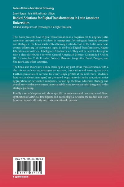 Part 1: The Latin American Context.- Chapter 1: Digital Transformation across the Continent.- Chapter 2: Higher Education across the Continent.- Chapter 3: Artificial Intelligence and Industry 4.0 across the Continent.- Part 2: Learning Contexts and Settings.- Chapter 4: Learning Management Systems and Online Settings.- Chapter 5: Learning Analytics Applied to Online and Blended Settings.- Chapter 6: Online Innovation in Higher Education Contexts.- Part 3: Emerging AI and Technology 4.0 Trends in Education.- Chapter 7: Aggregated Resources and Networks for a Global Campus.- Chapter 8: Personalised, Adaptive Services for Students, Professors and Academics Managers.- Chapter 9: Inclusive and Integrative Technology in Education.- Part 4: Digital Strategy, Digital Transformation.- Chapter 10: From Face-to-Face Processes to Cloud Services and Online Environments.- Chapter 11: Business and Sustainability Models for Universities.- Chapter 12: Strategic Planning and Academic Management.- Part5: Case Studies.- Chapter 13: Digital Transformation as a Backbone of a Higher Education Institution: Case Study.