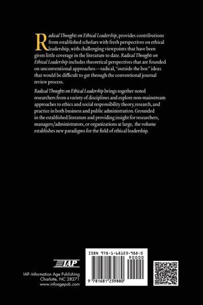 Radical Thoughts on Ethical Leadership, provides contributions from established scholars with fresh perspectives on ethical leadership, with challenging viewpoints that have been given little coverage in the literature to date. Radical Thoughts on Ethical Leadership includes theoretical perspectives that are founded on unconventional approaches-radical, "outside the box" ideas that would be difficult to get through the conventional journal review process. The volume brings together noted researchers from a variety of disciplines and explore non-mainstream approaches to ethics and social responsibility theory, research, and practice in both business and public administration. Grounded in the established literature and providing insight for researchers, managers/administrators, or organizations at large, the volume establishes new paradigms for the field of ethical leadership.
