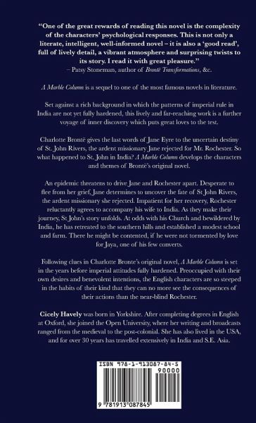 Charlotte Brontë gives the last words of Jane Eyre to the uncertain destiny of St. John Rivers, the ardent missionary Jane rejected for Mr. Rochester. So what happened to St. John in India? A Marble Column develops the characters and themes of Brontë's original novel.