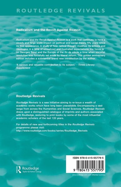 Radicalism and the Revolt Against Reason is a work that continues to have a steady and large scale impact on political and social theory fifty years since its first appearance. A study of how radical thought modifies its actions and ideologies in a time of unrealized and frustrated expectations, the focus is on Georges Sorel and the Europe of the fin de siècle, a time when socialist revolution was forcefully set aside by liberal reform. In a technique that presaged contemporary period, radical demands did not simply dissolve or disappear, they profoundly changed emphasis from the impersonal forces of history to highly personal forces of individual will. This edition includes a substantial brand new introduction by the author.