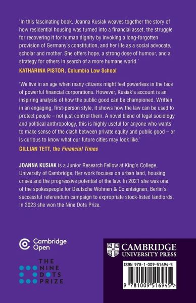 Right in the middle of the German constitution, a group of ordinary citizens discovers a forgotten clause that allows them to take 240,000 homes back from multi-billion corporations. In this work of creative non-fiction, scholar-activist and Nine Dots Prize winner Joanna Kusiak tells the story of a grassroots movement that convinced a million Berliners to pop the speculative housing bubble. She offers a vision of urban housing as democratically held commons, legally managed by a radically new institutional model that works through democratic conflicts. Moving between interdisciplinary analysis and her own personal story, Kusiak connects the dots between the past and the present, the local and the global, and shows the potential of radically legal politics as a means of strengthening our democracies and reviving the rule of law. This title is also available as Open Access on Cambridge Core.